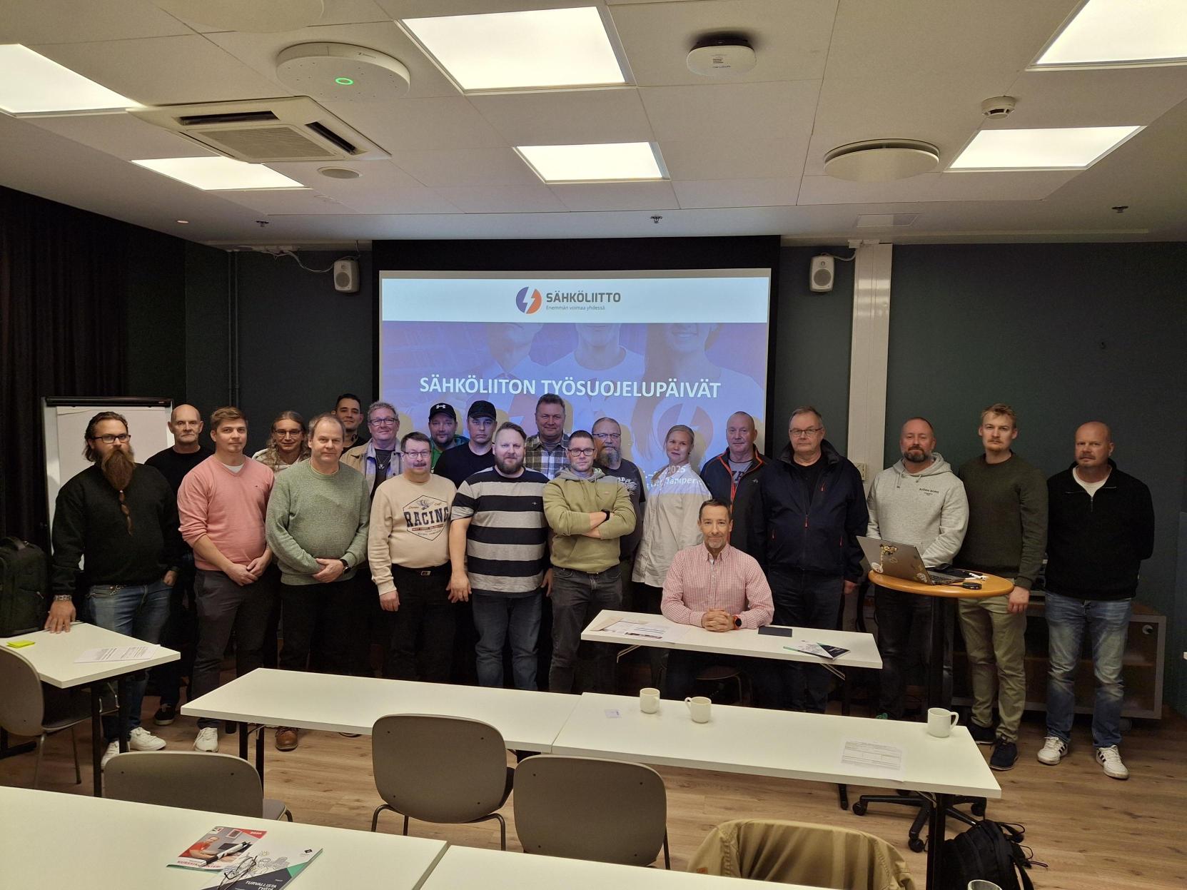 Tampereen työsuojelupäiville osallistui parikymmentä innokasta aktiivia. Kuvassa etualalla istumassa Kiljavan opiston työsuojelukouluttaja Simo Jästerberg. Tampereella järjestettiin 7.–8. marraskuuta Sähköliiton työsuojelupäivät, jotka kokosivat yhteen työsuojeluvaltuutetut ja luottamusmiehet päivittämään osaamistaan sekä verkostoitumaan. … Lue lisää